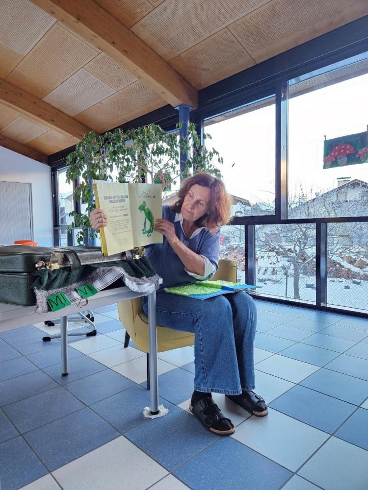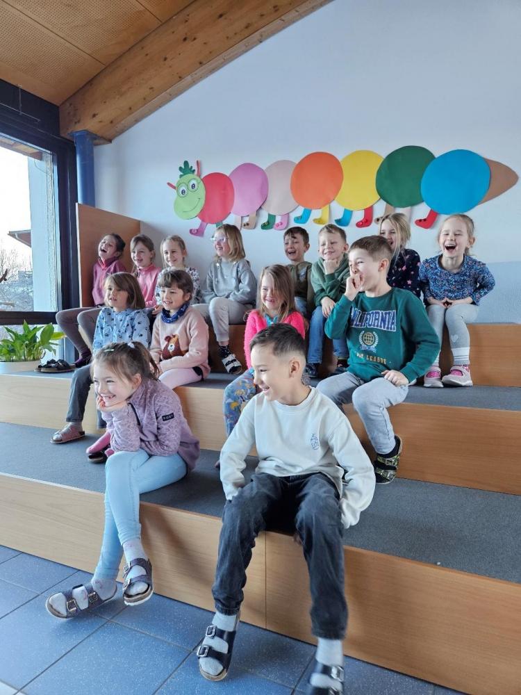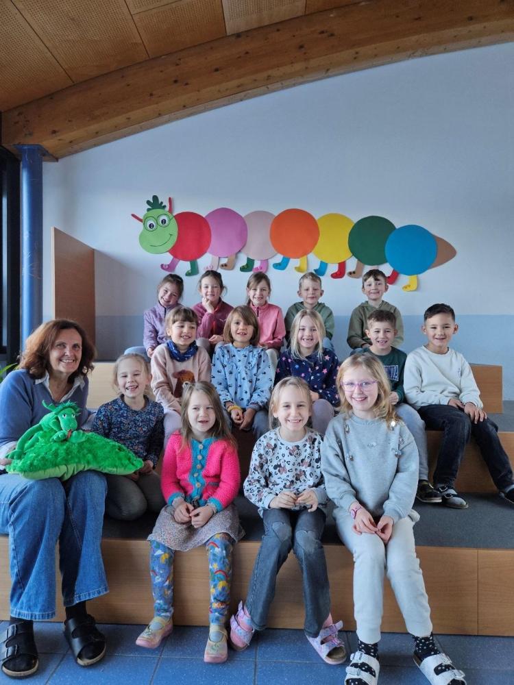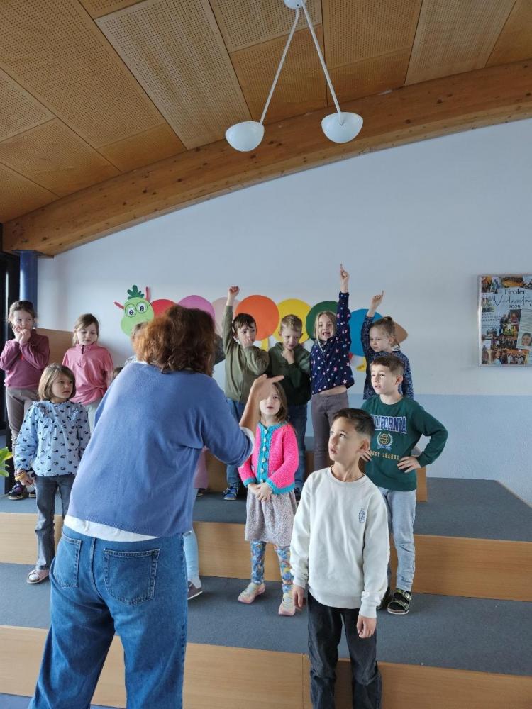 Im Rahmen des Tiroler Kulturservices (TKS) stellte Frau Sabine Moser den Kindern der 1b Klasse ihr liebevoll gestaltetes Bilderbuch über einen schlafenden Riesen vor. Damit der Riese seinen Kristallschatz auch bewachen kann und nicht ständig einschlummert, braucht es einen lebendigen Drachen (mit vielen Funktionen), der auf ihn aufpasst. Die Kinder durften beim Wecken helfen und wurden so Teil der Geschichte. Als dann noch gemeinsam die Drachenhöhle aufgeräumt und alle möglichen Gegenstände hervorgezaubert wurden, konnte sich niemand mehr vor Lachen halten!
