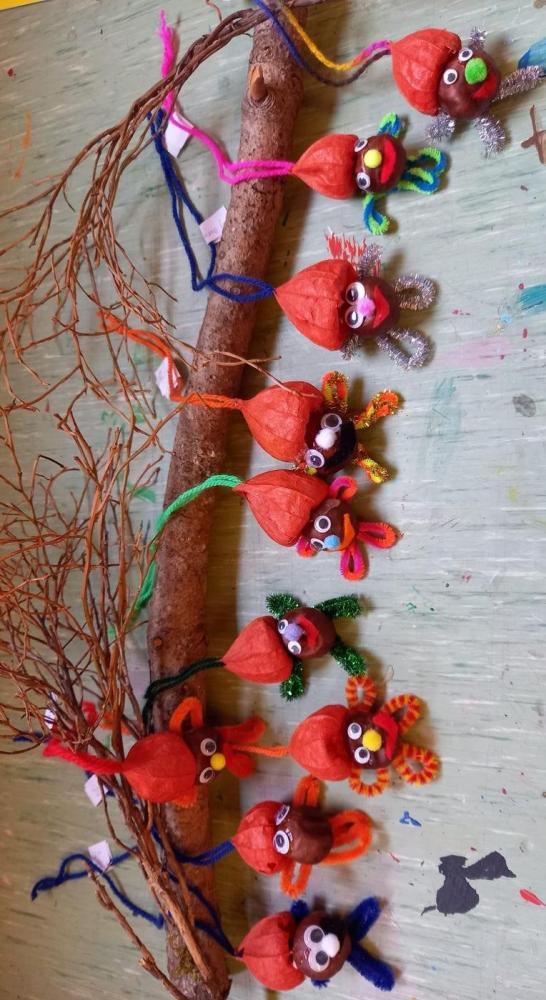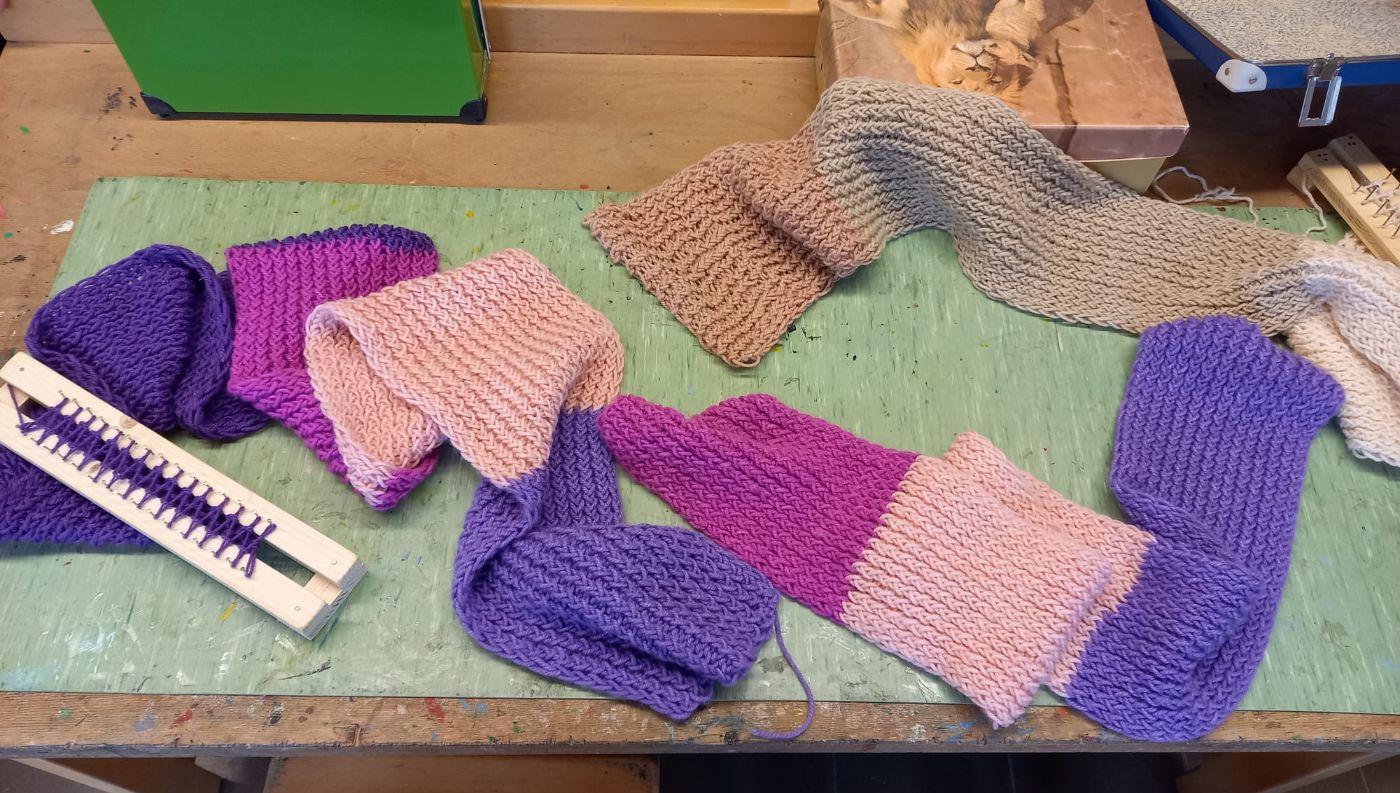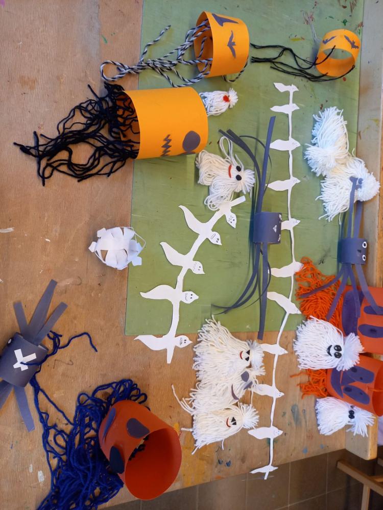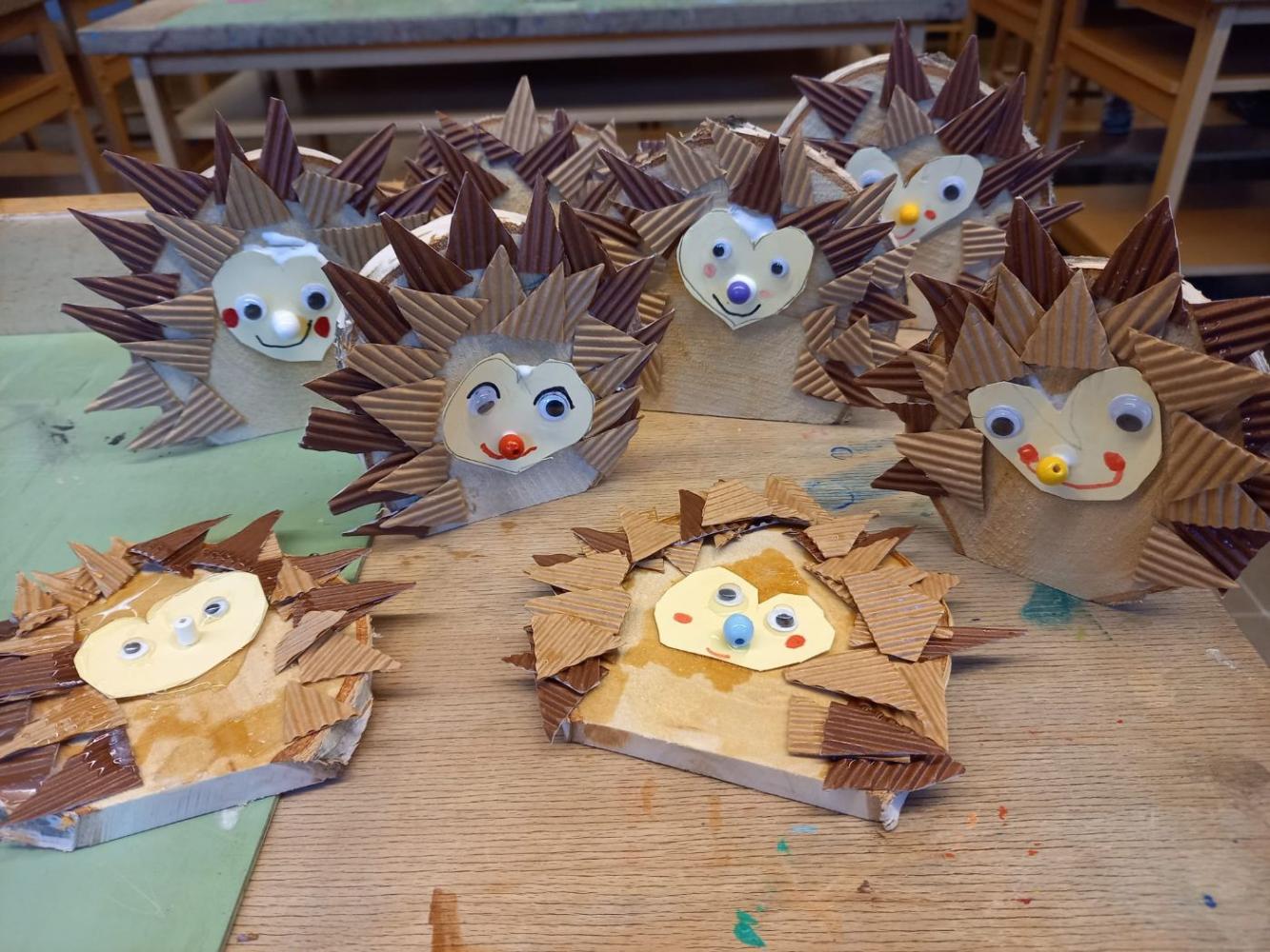Die neuen Werkstücke können sich sehen lassen. Die vorgegebenen Themen ließen genug Freiräume für individuelles und kreatives Arbeiten. So entstanden in den 1. Klassen Holzigel und Wickelfiguren, in der 2. Klasse Flugzeuge und Kastanienwichtel, in den 3. Klassen Amphibienboote und gewebte Hängematten und in den 4. Klassen Strickrahmen für Schals und frei interpretierte Arbeiten im Halloween-Design.