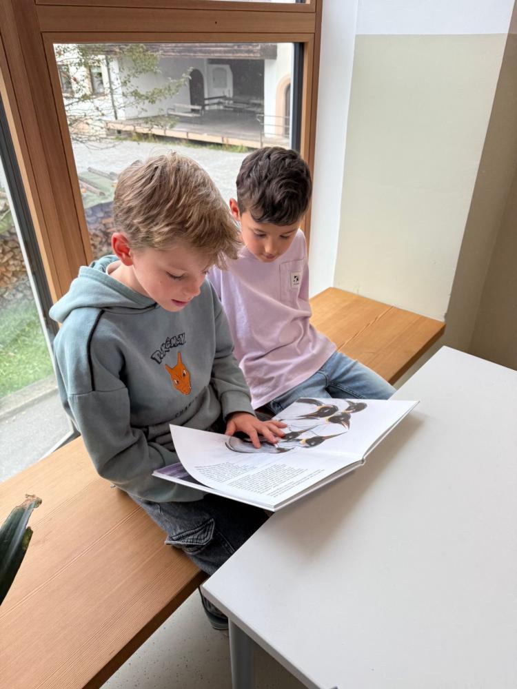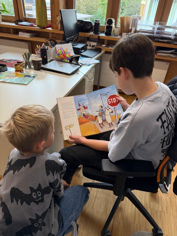 Auch mit der 2b wird fleißig gelesen: Hier übernehmen nicht nur die Viertklässler:innen das Vorlesen – auch die Zweitklässler:innen selbst lesen bereits für die 4b. Das klappt richtig gut und macht allen großen Spaß!