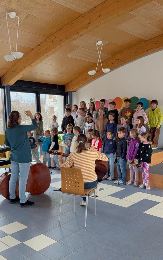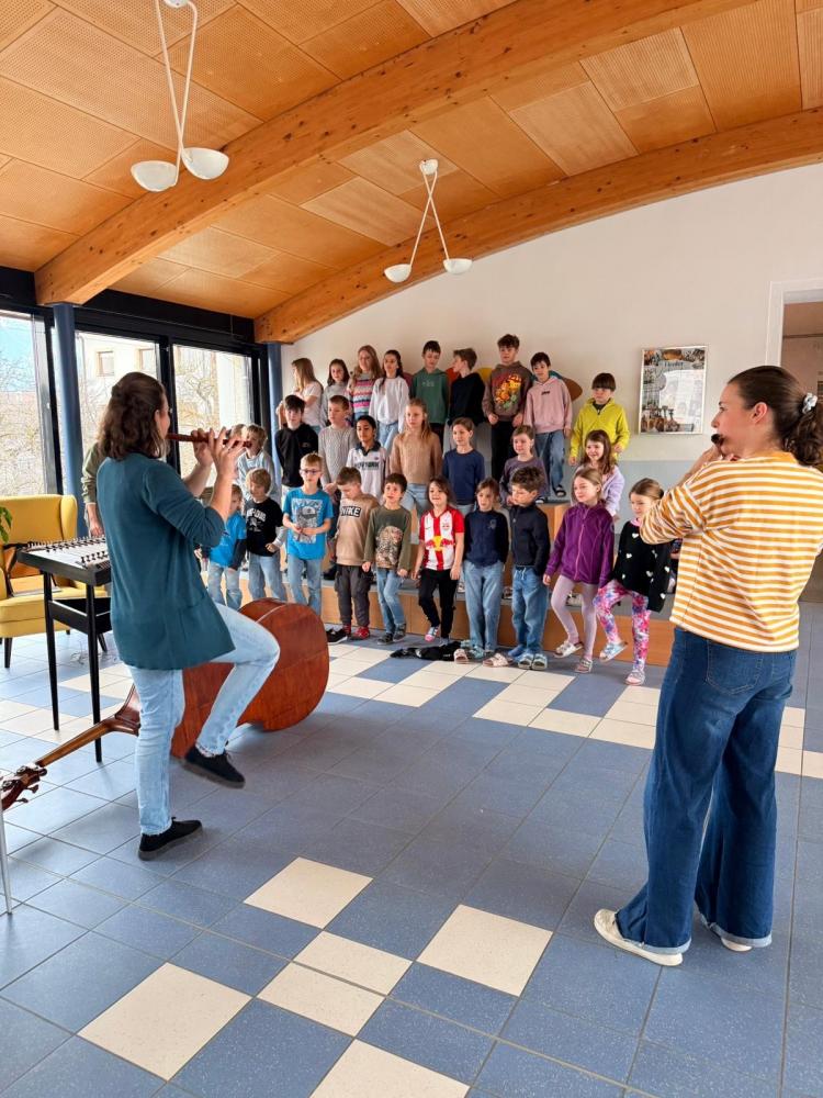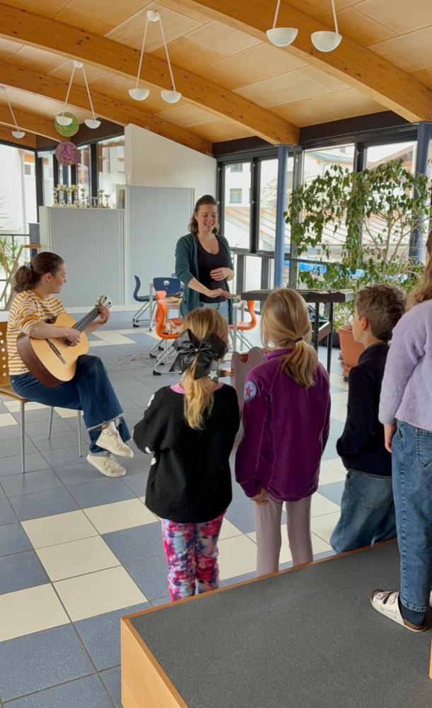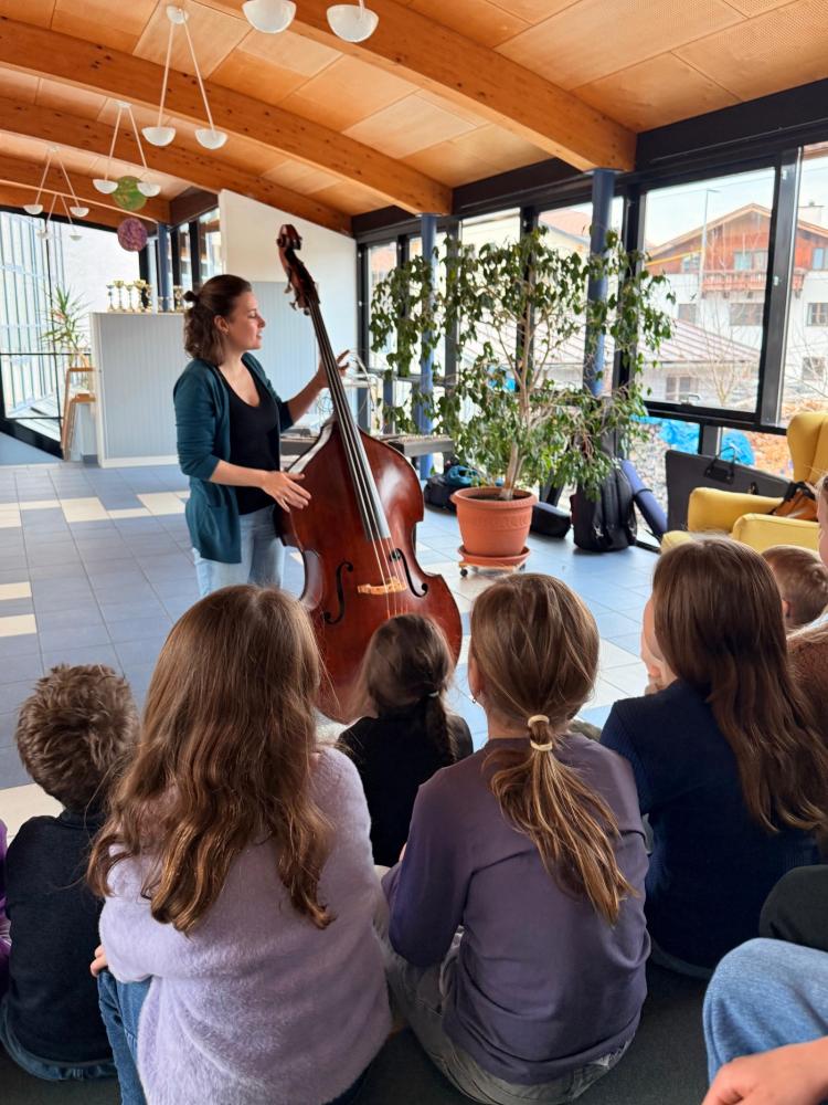 Mit im GepĂ€ck hatten Anna und Lisa eine beeindruckende Auswahl an Instrumenten: Kontrabass, Hackbrett, Gitarre, Querflöte, Schwegelpfeife und viele verschiedene Okarinas. Anschaulich und kindgerecht erklĂ€rten sie, wie auf den verschiedenen Instrumenten ein Ton entsteht. AuĂerdem erfuhren wir, welche Instrumente die Begleitung eines MusikstĂŒcks ĂŒbernehmen und welches Instrument die Melodie spielt.