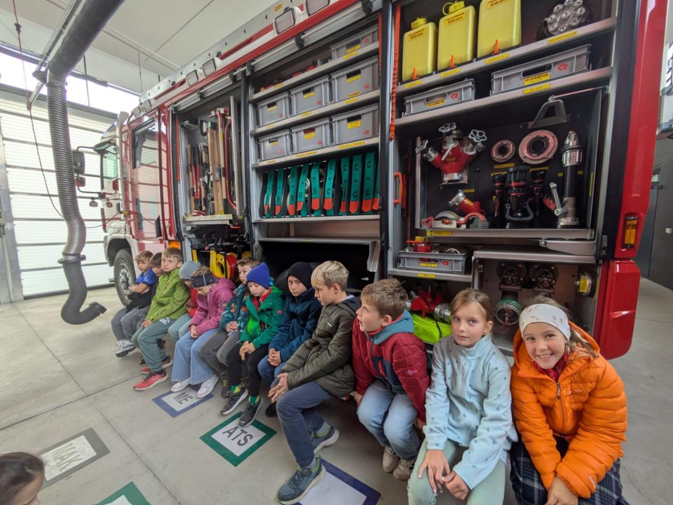 Schon bei der Ankunft wurden wir herzlich vom Feuerwehrmann Alexander Nairz empfangen. Nach einer kurzen Einführung durften die Kinder selbst aktiv werden und das Feuerwehrhaus besichtigen. Besonders spannend war die Besichtigung der Einsatzfahrzeuge – vom großen Tanklöschfahrzeug bis hin zur Ausrüstung, die im Ernstfall Leben rettet. Auch das Anprobieren von Helmen und Schutzkleidung sorgte für leuchtende Augen.